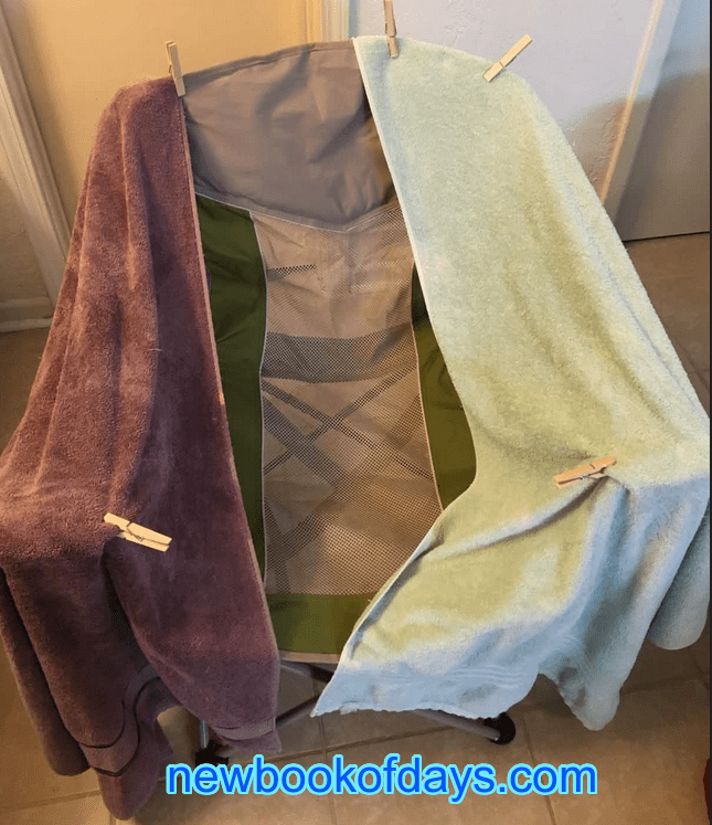 Just in case you haven’t seen this setup before, it works as well inside the house as it does when you are actually out camping. You can even clothespin socks and underthings to it. These camp chairs and other camping items seem to be easier to acquire in some areas than laundry drying racks but they do work the same or better. Whatever you can clip clothespins to and hang coat hangers from is fair game. I have not tried to use this for herbs yet, but in theory it could be done from a tent frame.